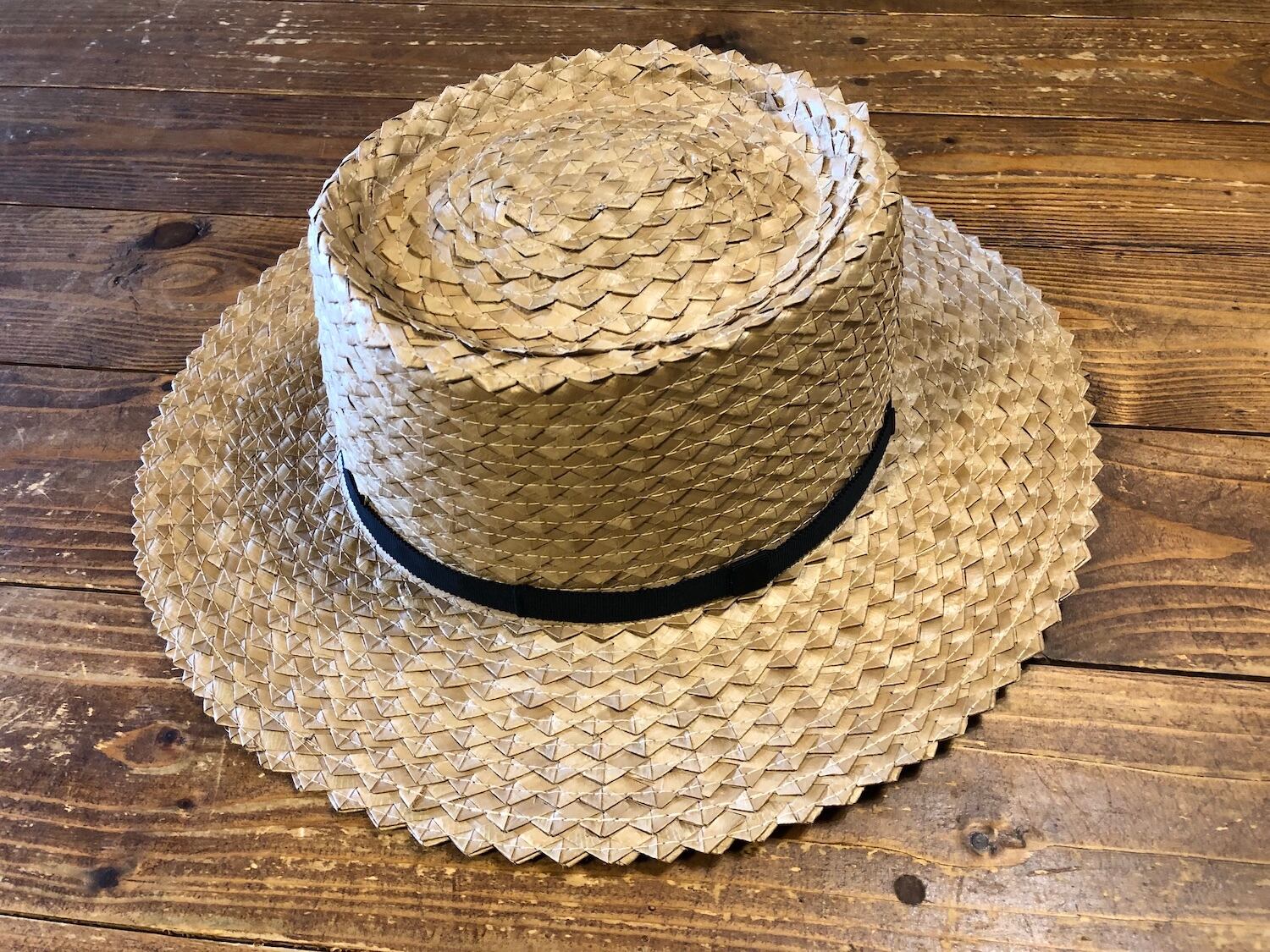 ヤシをジグザグ状のブレードに編み、ブレードミシンで縫い上げました。軽くてユニークなデザインです。燻したようなスモークカラーの本体に細い黒のリボンで飾り付けしています。トップはポークパイ型のデザインです。